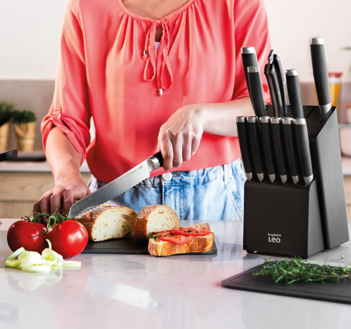 პურის საჭრელი დანა დამზადებულია უჟანგავი ფოლადის პირისგან,